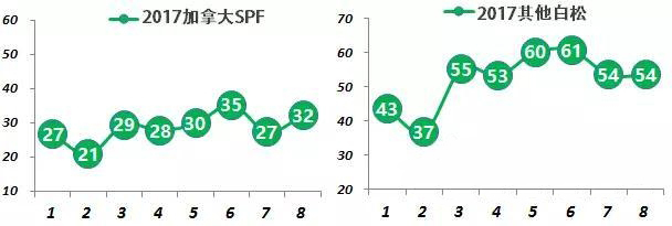 來自瑞、芬、俄的北歐云杉,前8個月累積進口418萬立方米,占白松總量的65%;加拿大SPF本月略有回升,8月進口32萬立方米。
